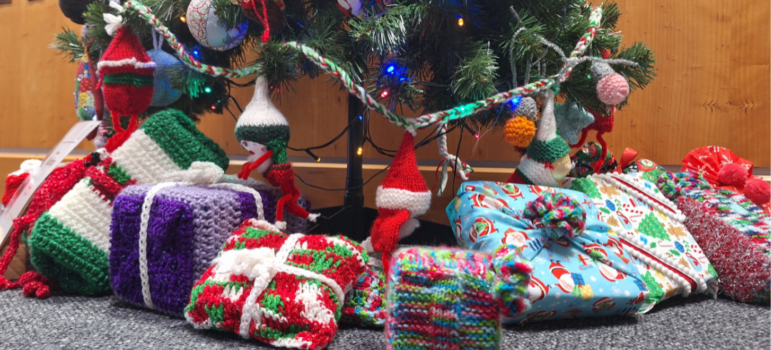 Knitted and fabric wrapped gifts under a tree at the Soroptimist Christmas Tree Festival