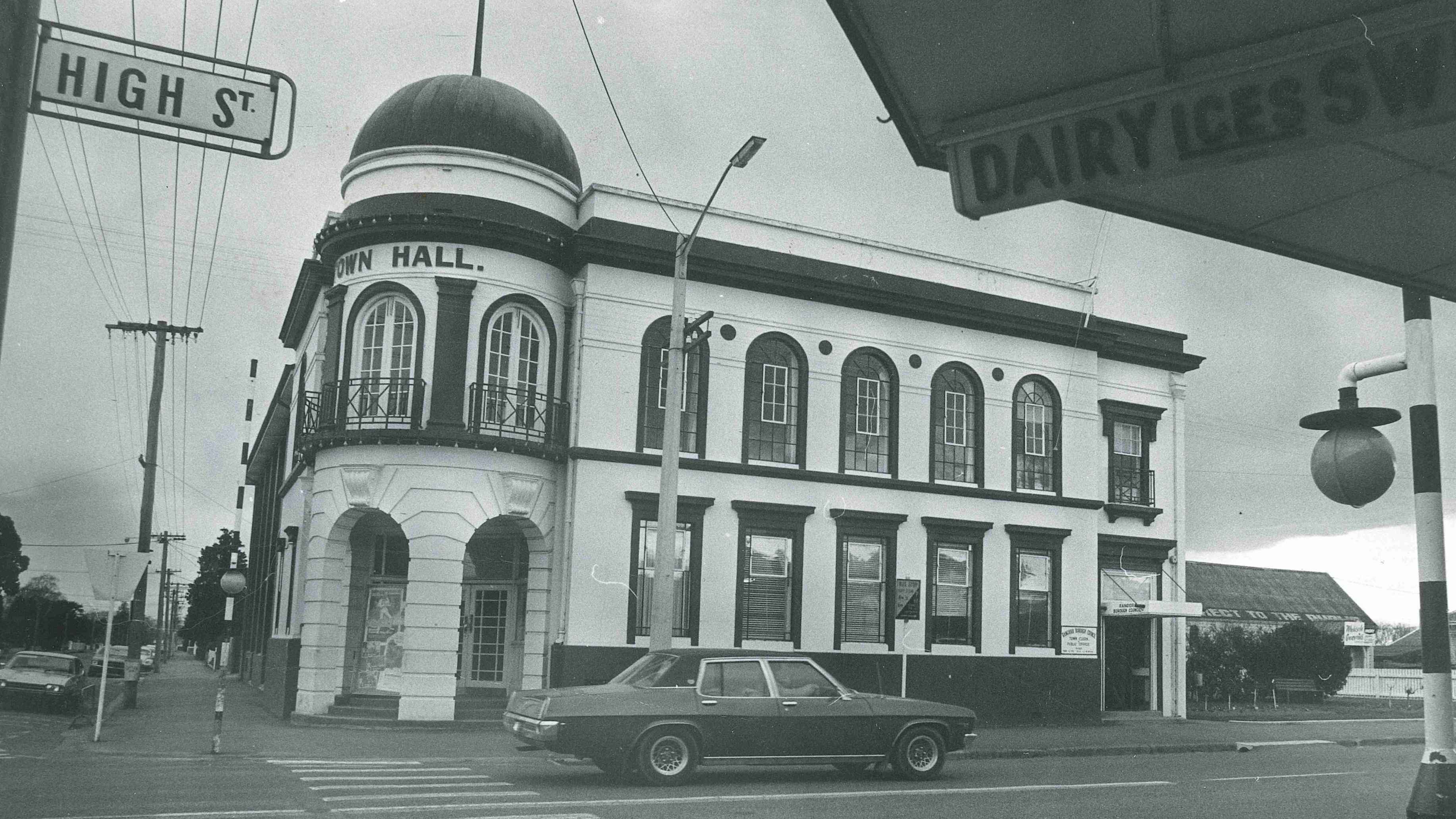Photo caption: Rangiora Town Hall, c.1975 [attribution: Waimakariri Heritage website].