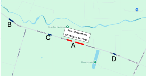 Commencing on 17 November, and will include a gravel overlay at Site A, and pavement repairs at Sites B and C. The road closure for these works will require the Stage 1 detour routes as per the diagram below. However, once Site B has been completed, the closure will be reduced to east of the Kennedys Road intersection.