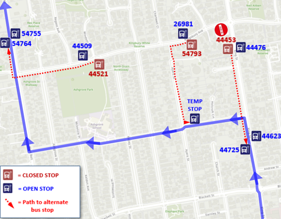 - Bus Stop Changes: Minor adjustments to bus routes and stop locations will be required. Please refer to the Bus Detour diagram below for details.