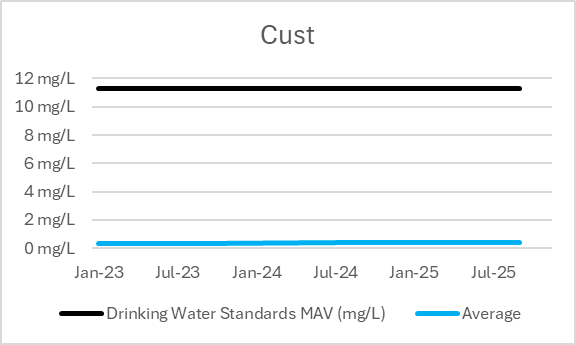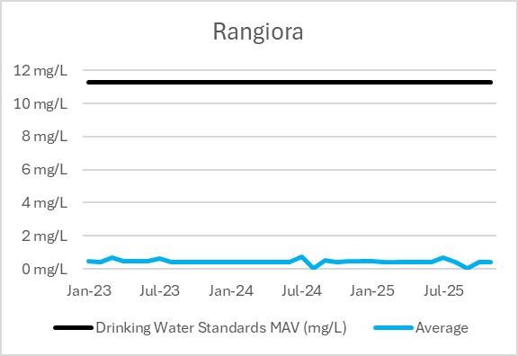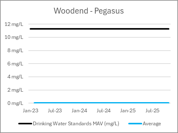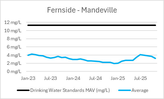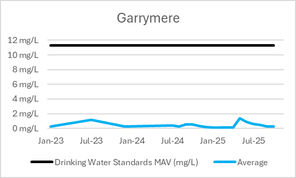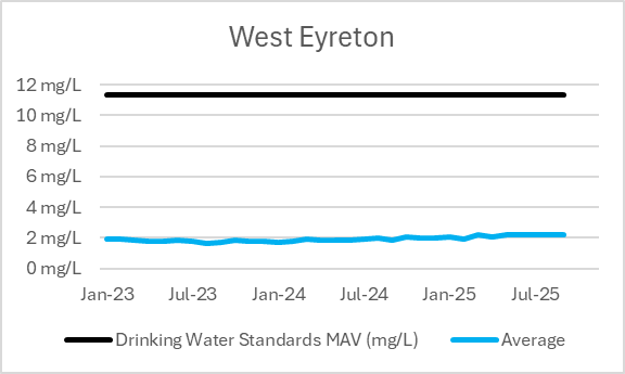 | Supply | Bore | Last Result Nitrate-Nitrogen (mg/L) | Range Minimum January 2023-December 2025 | Range Maximum January 2023-December 2025 | Drinking Water Standards MAV (mg/L) |